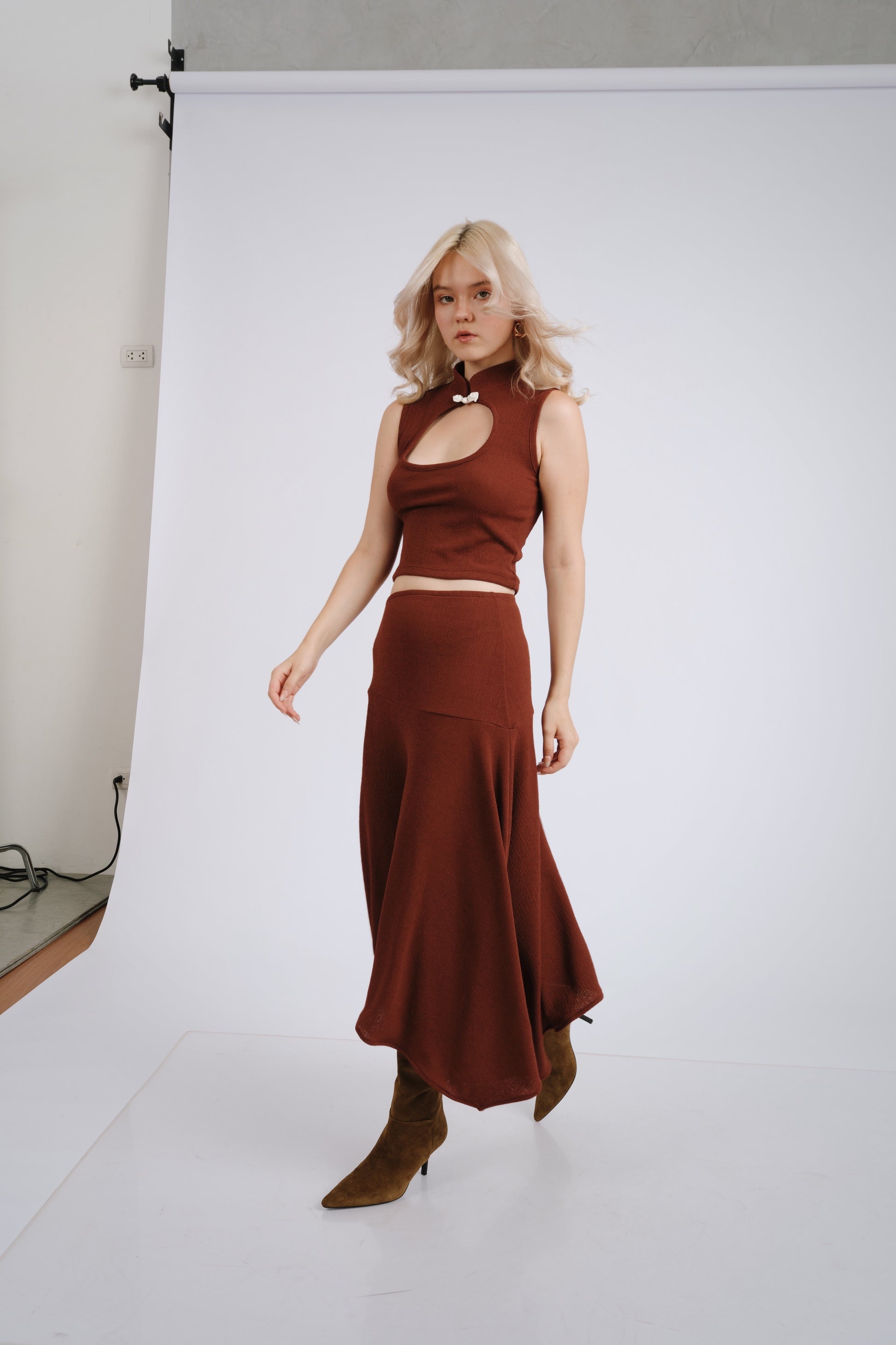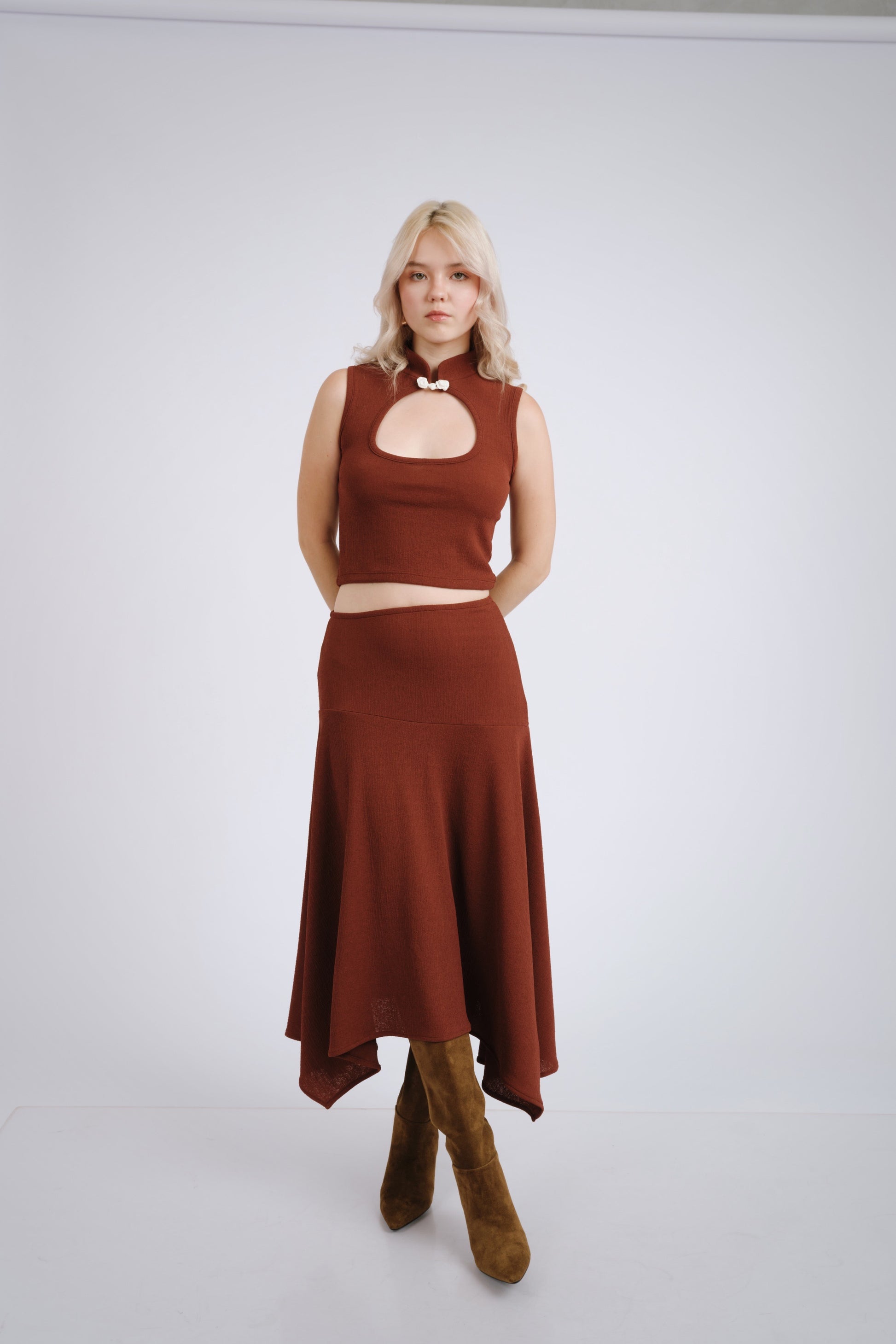 Falda asimétrica lacre