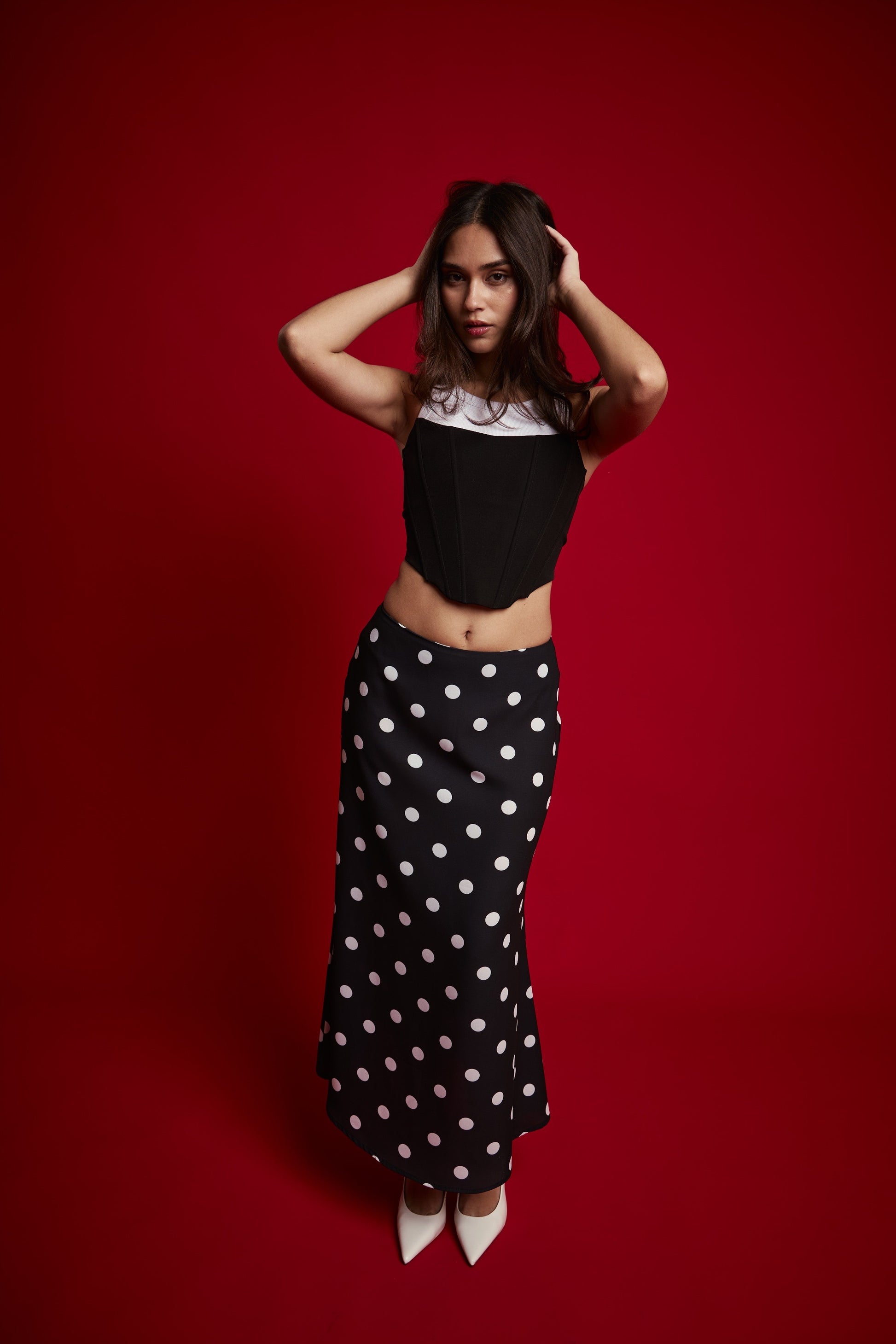 falda estilo midi con pinzas y cierre invisible en la parte de atrás.