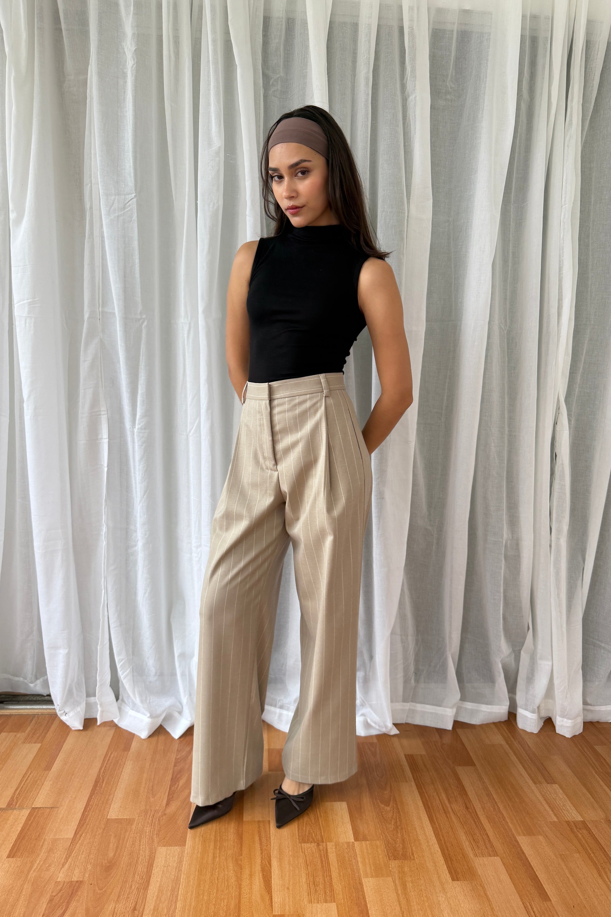 Pantalón estilo sastre con diseño de rayas verticales, lleva 1 pinza en cada lateral, bolsillos escondidos, trabilla y broche invisible.